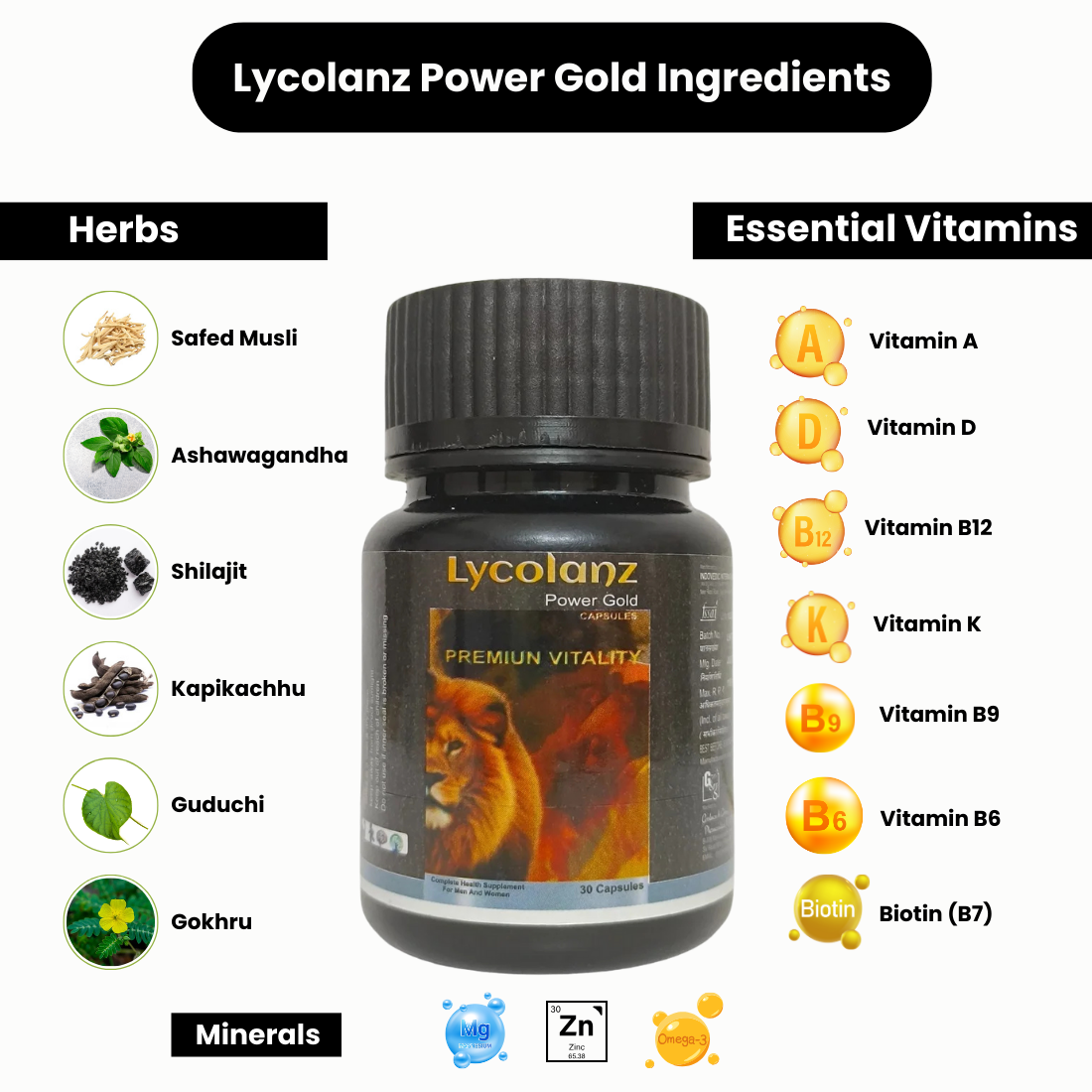 Lycolanz Power Gold – is a daily multivitamin capsule specifically designed to provide essential vitamins, minerals with herbs to improve sex performance. It contains a unique blend of Ayurvedic herbal ingredients such as Ashawagandha, Safed musli, Guduchi, Gokhuru, Kapikachhu, Kokilaksha, Vidarikand, and Shilajit, which are known to help improve libido, energy, and stamina also provide optimum nutritional support for private health.